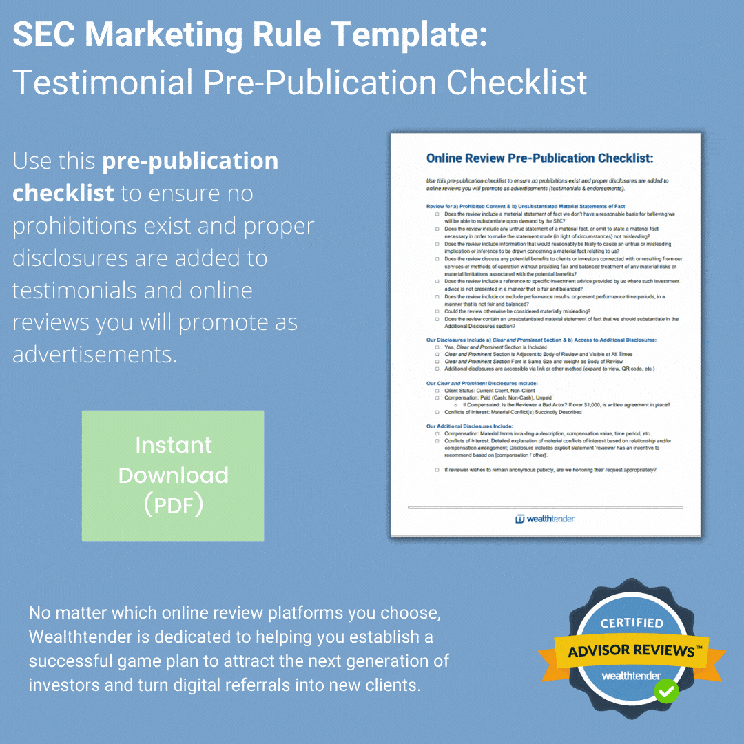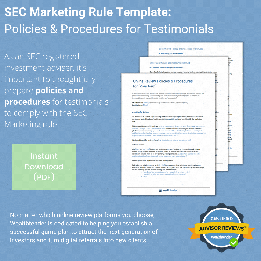 We prepared this step-by-step playbook to help you compliantly turn your online reviews into an evergreen source of digital referrals. You might also enjoy our SEC Marketing Rule Education Series of articles, templates, and checklists designed to help you get started with testimonials and endorsements.