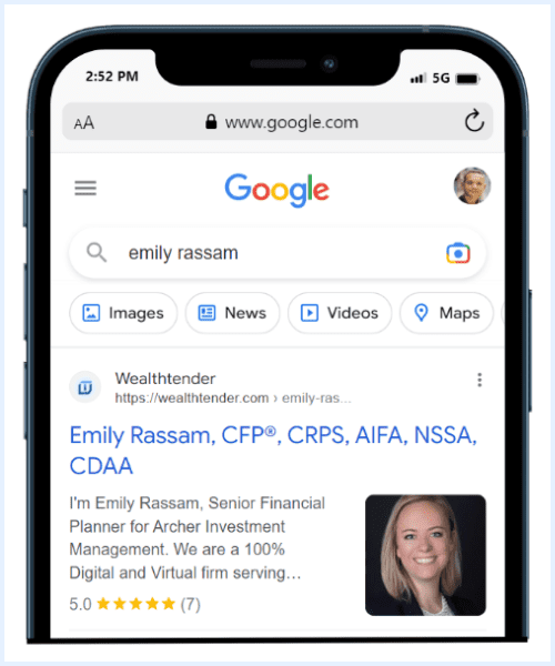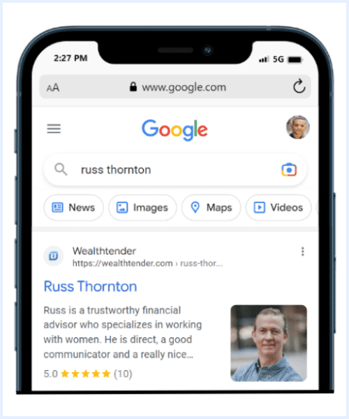 By joining Wealthtender, financial advisors increase their E-A-T scores in the eyes of Google, strengthening their online reputation and improving their ranking in online search results.