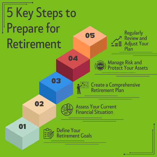 A well-tailored retirement plan, focusing on the most important aspects of your life, can provide financial security and peace of mind. Retirement planning isn’t a one-time event but a continual process which grows and moves with you. Let’s go over the five main steps needed to prepare for retirement.