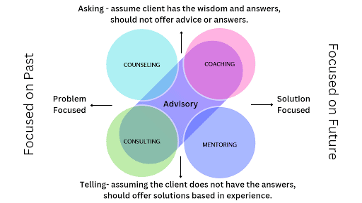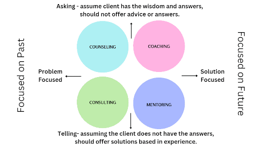 The first difference is in the approach to their core methods. None of these are good or bad, but if someone needed a mentor, counseling is not going to be the right fit. If someone needed a coach, a consultant would not be the right fit.