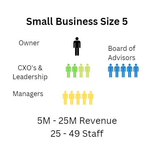 Size 5: 25-49 staff or 5M-25M in revenue, owner is CEO, building out CXOs.