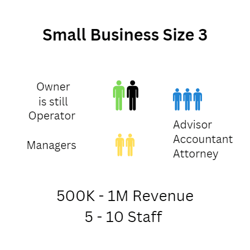 Size 3: 5-10 staff, 500K-1M in revenue, owner is still the operator and primary rainmaker.