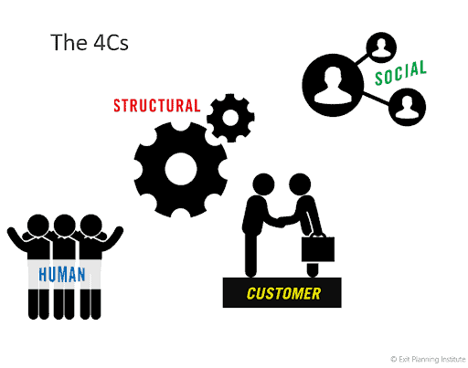 Daniel: The Four C’s of Intangible Capital (from the Exit Planning Institute) are the biggest direct drivers of Intangible Value. They represent mostly Intangible Assets that can contribute to a 4X+ multiple of value when the business is sold. To put that into perspective, optimized tangible assets (that are measured by accounting systems) can lead to a 1-2X multiple of value.