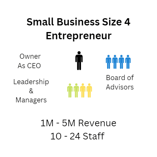 Size 4: 10-24 staff, 1M-5M in revenue, owner is still the operator and CEO.