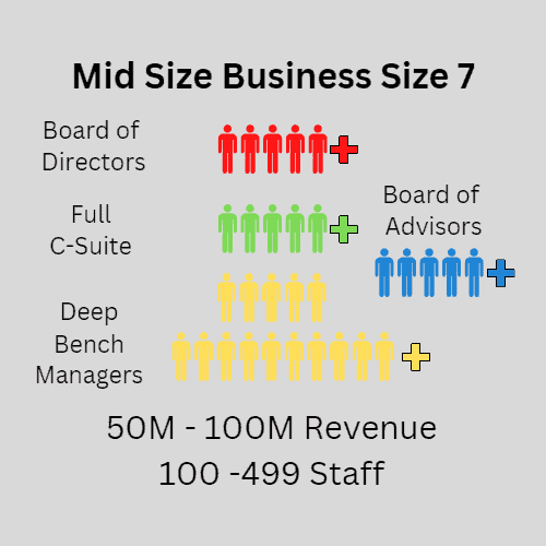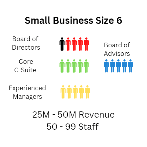 Size 6:  50-99 staff or 25M-50M in revenue, Owner has a Core C-suite, and is often the chair of the Board of Directors.