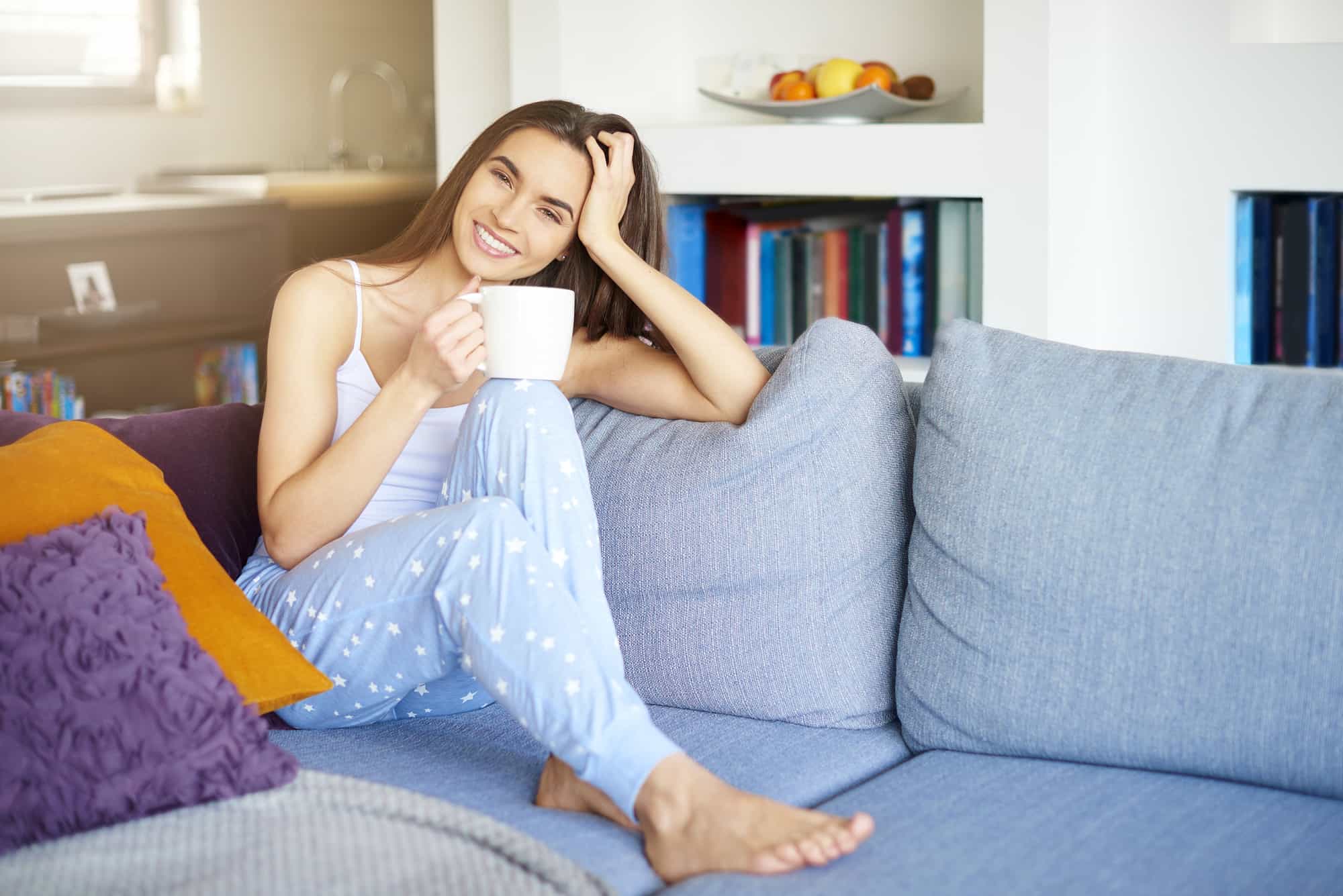 Shot of young pretty woman wearing pajamas and drinking tea while relaxing on sofa early morning.