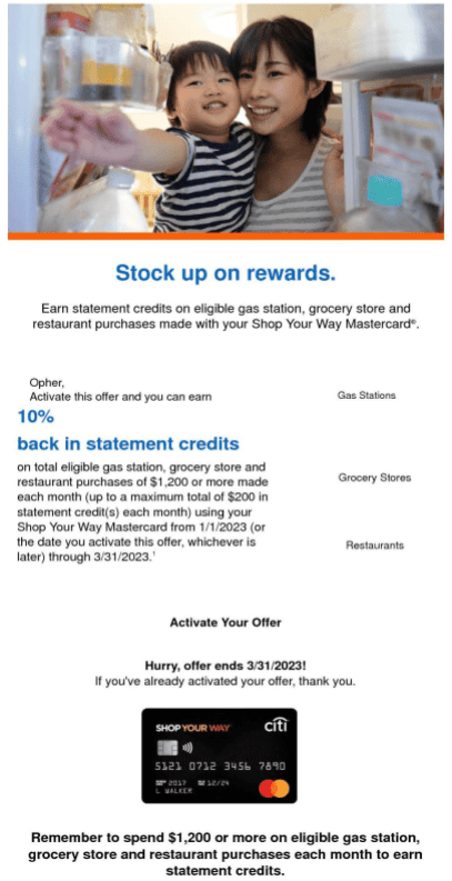 • Shop Your Way (SYW) Mastercard is what I pull out at grocery stores, gas stations, and restaurants, with over 13% rewards (see below).