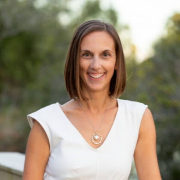 Confident professional smiles in a headshot with a nature-inspired backdrop.