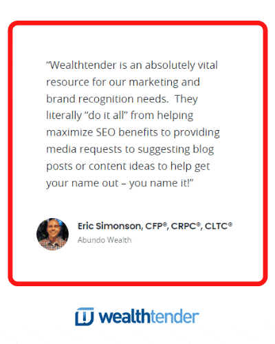Wealthtender helps financial advisors and wealth management firms get more clients online with done-for-you digital marketing services for a low monthly cost. Learn more and get started in less than 5 minutes by clicking the big red button.